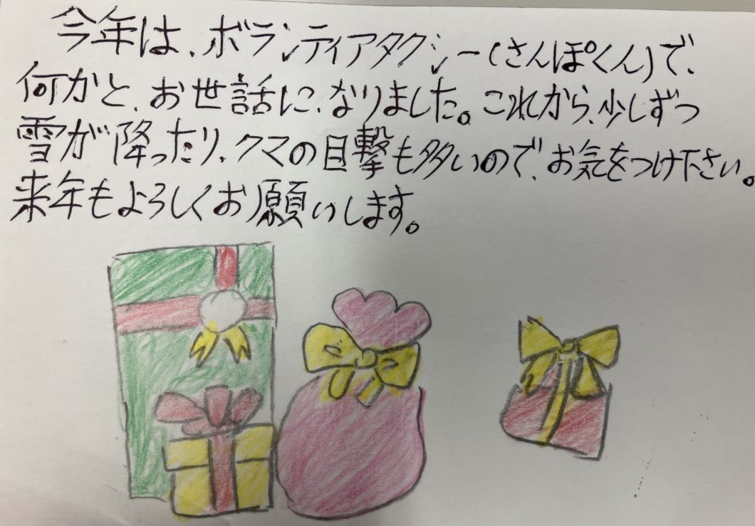 会員登録固定バナー HOME > INFO&活動報告 > INFO&活動報告 ボラタクさんぽくん うれしいお便り 投稿日:2025年12月10日 数日前、さんぽくんを利用している方から葉書が届きました。ほっこりしますね。 少し前になりますが、別の利用者さんが「飾って~!」と、ご自身で書いた作品を持ってきてくださいました。 事務所にそろそろこたつも出す予定です。 お近くの方はぜひ見にいらしてください。心も身体もあたたまりましょう(^^♪ -INFO&活動報告, ボラタクさんぽくん